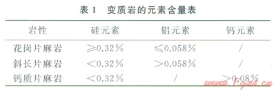 在巖心歸位的基礎上,利用不同巖性的數據點繪制中子密度交會圖,花崗片麻巖的樣本點落在砂巖線上或其上方,斜長片麻巖的樣本點在白云巖線上,鈣質片麻巖的樣本點在石灰?guī)r線和白云巖線之間。元素俘獲譜測井可以得到地層中主要的元素含量,可用于化學成分不同的變質巖的區(qū)分[6]?;◢徠閹r的石英長石含量高,暗色礦物含量低,因此元素俘獲譜上硅元素含量高,而鋁元素含量低;鈣質片麻巖含有較多的碳酸鹽礦物,因此元素俘獲譜上鈣元素含量高、硅元素含量低;斜長片麻巖含有較多的角閃石等暗色礦物,因此元素俘獲譜上硅元素含量相對低而鋁元素含量相對高,不同巖性的元素含量如表1所示。