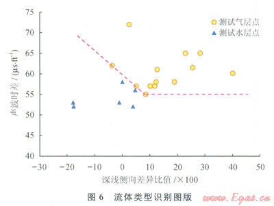 采用深、淺側向的差異同深電阻率的比值與聲波的交會圖來確定流體性質(圖6)。從圖6中看出氣層點都位于右上方,而水層點位于左下方,從測井的原理上看含氣好的層段深淺側向有較大的正差異特征或者小的負差異,而水層由于淡水鉆井液的侵入會使得電阻率出現負差異,當然裂縫的發(fā)育情況及產狀對電阻率的影響比較大,但從解釋結果看都是以網狀裂縫為主。因此認為電阻率的差異與流體類型存在一定的聯系。