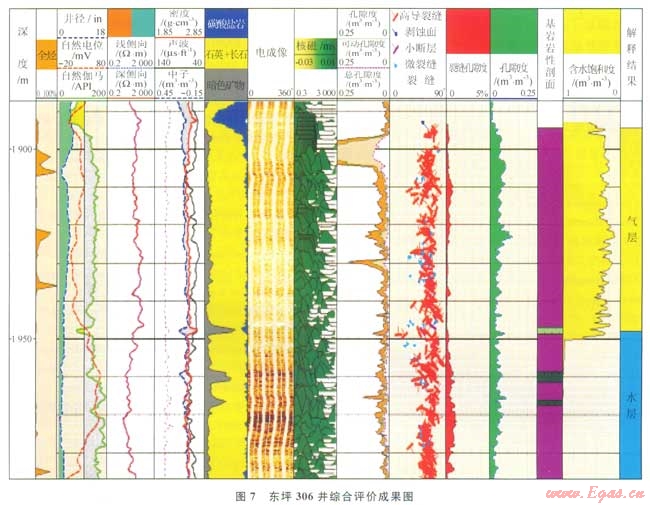 氣層與干層的確定是以孔隙度大大小進行劃分的。核磁資料表明當孔隙度為2%時,可動流體只有1%,同時參考了國內外眾多的古潛山油氣藏,以孔隙度2%作為有效儲層的下限。據前述方法對區(qū)塊內的井進行了綜合評價,如圖7所示為東坪306井的評價成果圖。該井1894.5m以下為花崗巖,電成像表明高導裂縫非常發(fā)育,裂縫孔隙度分布在0.05%~0.5%之間,總孔隙度為6.2%,計算的含氣飽和度為70%,深、淺側向有小的正差異氣測錄井顯示較好(中部因取心氣測低),解釋為氣層;下部巖性、物性與上部相當,但電阻率明顯降低,且深、淺側向基本重合,氣測無顯示,解釋為水層,據此確定了氣水界面。其數據為:井段1894.5~1950.0m,電阻率20~100W·m,核磁可動孔隙度3.2%,溶蝕孔隙度6.2%,裂縫走向NWSE,裂縫孔隙度0.02%~0.50%,含氣飽和度70%,解釋為氣層;井段1950.0~2097.3m,電阻率4~80W·m,核磁可動孔隙度1.5%,溶蝕孔隙度4.0%,裂縫走向NWSE,裂縫孔隙度0.05%~0.80%,含氣飽和度為0,解釋為水層。