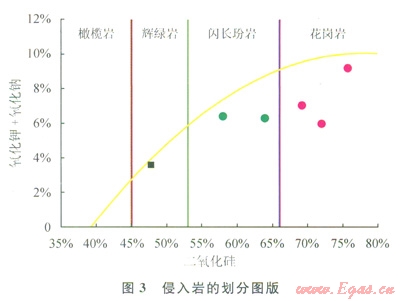儲層巖性識別是油氣藏評價的前提和基礎工作,與常見的沉積巖不同的是基巖巖性復雜多變,測井識別困難。地面露頭踏勘和鉆井巖心分析表明東坪氣田的基巖包括火成巖和變質巖兩大類巖性(圖1),北部3井區(qū)基巖以侵入巖為主,南部1井區(qū)以變質巖為主。研究表明侵入巖主要為花崗巖,中間夾有輝綠巖、閃長玢巖的巖脈。變質巖可分為3大類,分別為花崗片麻巖、斜長片麻巖和鈣質片麻巖。侵入巖和變質巖的區(qū)分可利用鉀和自然伽馬的交會圖(圖2)。由于侵入巖以鉀長石含量較高的花崗巖為主,其鉀含量和自然伽馬為相對高值,變質巖的鉀和自然伽馬相對低值。因此侵入巖位于交會圖的右上角而變質巖位于交會圖的左下方。利用元素俘獲譜資料實現兩大類巖性的細分。二氧化硅與氧化鈉和氧化鉀之和的交會圖(圖3)實現侵入巖的細分,花崗巖的二氧化硅含量高,為66%,輝綠巖為45%~53%,閃長玢巖為53%~66%。據此實現了北部3井區(qū)基巖儲層巖性的識別與劃分。變質巖的種類繁多且其成因復雜,因而變質巖的識別與劃分相對侵入巖要復雜得多。通常認為在變質巖的形成過程中化學成分穩(wěn)定,這為利用元素俘獲譜測井劃分巖性提供了有利條件,同時由于礦物成分的不同其密度與中子值也有所不同。因此常規(guī)曲線對巖性的劃分也提供了好的資料。