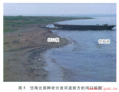 河口壩位于分流河道入湖口前方,總體呈舌狀,地形上略有隆起,壩脊大體垂直湖岸延伸,是河水靠慣性向前方流動、沉積所致(圖5,由于水位下降,部分河口壩已露出水面)。河口壩向湖內(nèi)延伸距離為幾十米到100多米,可延至水深1.5m左右處。