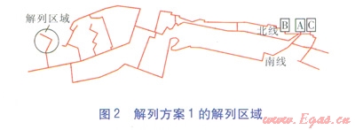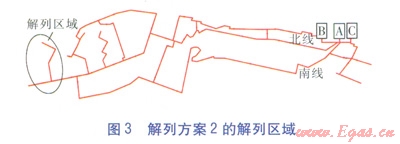 按照解列最不利熱用戶的原則,并根據(jù)閥門(mén)設(shè)置情況,選取解列方案1、2。兩種解列方案中解列區(qū)域分別見(jiàn)圖2、3。解列方案1、2的解列區(qū)域分別包括15、34個(gè)熱用戶,被解列熱用戶總設(shè)計(jì)質(zhì)量流量分別為1030、2220t/h。解列區(qū)域最低限額供熱系數(shù)仍取0.807,則解列方案1、2的解列區(qū)域事故工況下的質(zhì)量流量分別為832、1792t/h。