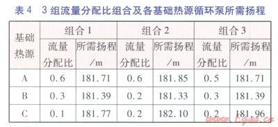 根據(jù)各基礎(chǔ)熱源設(shè)計(jì)質(zhì)量流量,經(jīng)計(jì)算可得,基礎(chǔ)熱源A~C的流量分配比限額(最大值)分別為0.6、0.3、0.2。在南線出口事故工況下,按照10%步長(zhǎng)改變各基礎(chǔ)熱源流量分配比,可得到3組流量分配比組合。按照文獻(xiàn)[8]的計(jì)算方法,分別計(jì)算3組流量分配比組合中各基礎(chǔ)熱源循環(huán)泵所需揚(yáng)程。3組流量分配比組合及各基礎(chǔ)熱源循環(huán)泵所需揚(yáng)程見(jiàn)表4。