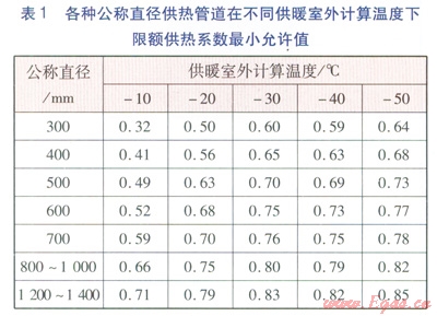 由于目前我國(guó)沒(méi)有限額供熱系統(tǒng)的具體規(guī)定值,因此參考CHnH 41—02—2003確定。各種公稱直徑供熱管道在不同供暖室外計(jì)算溫度下限額供熱系數(shù)最小允許值見(jiàn)表1。