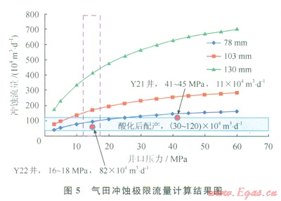 在氣田生產(chǎn)過(guò)程中,為了進(jìn)一步分析產(chǎn)量過(guò)高的原因產(chǎn)生的沖蝕,開展了不同單井井口壓力和產(chǎn)量下的臨界沖蝕流量的計(jì)算。根據(jù)氣田的具體情況,井口設(shè)備的節(jié)流閥通徑分別為78mm、103mm、130mm。因此,分別計(jì)算了氣田工況范圍下的單井極限沖蝕流量。根據(jù)計(jì)算結(jié)果可以看到,將2口典型井在試氣時(shí)的工況標(biāo)在計(jì)算圖(圖4)中,2口井均在沖蝕流量之下(圖5)。在氣田生產(chǎn)中,根據(jù)開發(fā)配產(chǎn),建議井口產(chǎn)氣量限制在70×104~95×104m3/d,少數(shù)井配產(chǎn)在100×104m3/d或以上時(shí),井口閥的尺寸要求換成100.5mm。由此確定井口采氣樹選擇如下:產(chǎn)量小于80×104m3/d,主通徑(標(biāo)稱尺寸)為78mm;產(chǎn)量在80×104~200×104m3/d,主通徑為103mm;產(chǎn)量大于200×104m3/d,主通徑為130mm。