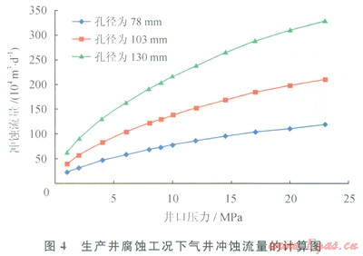 計(jì)算了不同井口壓力下不同孔徑尺寸(標(biāo)稱尺寸,最小內(nèi)徑)沖蝕流量(圖4),計(jì)算的生產(chǎn)工況范圍按照氣田的實(shí)際情況確定。根據(jù)計(jì)算,油壓為15~18MPa,井口溫度為60~70℃,Æ78mm節(jié)流閥抗沖蝕流量為85×104~112×104m3/d。氣田的產(chǎn)量最高達(dá)126×104m3/d,一般井產(chǎn)量均大于85×104m3/d。因此,生產(chǎn)過(guò)程中長(zhǎng)期存在沖蝕現(xiàn)象,這是井口腐蝕嚴(yán)重的重要原因之一。根據(jù)計(jì)算結(jié)果,在目前的工況下,為避免沖蝕和安全生產(chǎn),一些單井產(chǎn)量最好控制在85×104m3/d以下。