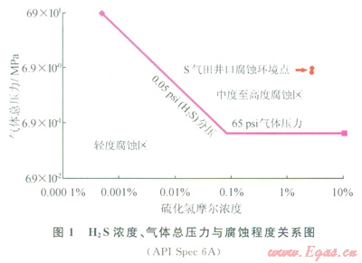 根據(jù)NACE標(biāo)準(zhǔn)H2S和CO2分壓與腐蝕程度關(guān)系(圖1),如果H2S氣體的分壓大于0.34474kPa(0.05psi絕對(duì)壓力,1psi=6.895kPa,下同),則必須使用抗硫化氫材料。根據(jù)腐蝕環(huán)境分析,氣田位于中至高度腐蝕區(qū)。氣田CO2分壓與H2S分壓之比小于200,系統(tǒng)腐蝕以H2S為主導(dǎo)。