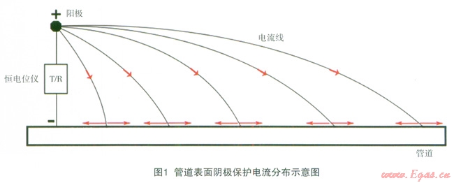陰極保護(hù)系統(tǒng)電路路徑的構(gòu)成包括:土壤、管道、導(dǎo)線[2]。對(duì)于直流電路來說,根據(jù)歐姆定律可以知道,電路中的電流在流動(dòng)過程中,電流會(huì)始終傾向于在電阻較小的路徑流動(dòng)。當(dāng)管道的防腐層面電阻率變化不大、防腐層沒有出現(xiàn)嚴(yán)重的破損點(diǎn)和接地的情況時(shí),管道表面陰極保護(hù)電流的分布是相對(duì)較為均勻的,如圖1所示。