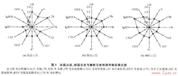 由于取心資料有限,要深入研究巖相特征,需要利用測井資料來實現(xiàn)。其基本原理主要是:不同沉積環(huán)境形成的巖石類別,其礦物成分、結(jié)構(gòu)、構(gòu)造等存在差異,導(dǎo)致地球物理屬性的差異,可在各種測井系列上出現(xiàn)差別響應(yīng),因而可根據(jù)各種測井信息的集總,建立各類巖相測井響應(yīng)歸一化模式庫(圖3)[3]。