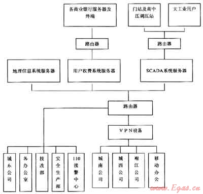 硬件網(wǎng)絡以地理信息系統(tǒng)服務器、用戶收費系統(tǒng)服務器和SCAD系統(tǒng)服務器為核心,采用一條50M和一條8M專用光纜與電信運營商連接,50M光纜分兩區(qū),其中16M帶寬用于收費服務器與8家聯(lián)網(wǎng)收費銀行聯(lián)系傳遞信息,34M帶寬用于辦公網(wǎng)絡上互聯(lián)網(wǎng)和燃氣綜合管理系統(tǒng)、用戶收費系統(tǒng)、SCAD系統(tǒng)通過VPN設備與遍布市區(qū)的東南西北四個分公司及營業(yè)服務廳聯(lián)網(wǎng)。8M光纜專門用于與各SCAD系統(tǒng)遙測遙控點數(shù)據(jù)傳輸和與集團公司SCAD控制中心數(shù)據(jù)交換(通過互聯(lián)網(wǎng))。