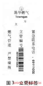 依據(jù)立管管徑的不同,使用不同規(guī)格的立管標簽。標簽上含有燃氣公司服務(wù)熱線、立管編碼的條形碼、燃氣公司信息、警示語等。目前公司已在轄區(qū)的居民小區(qū)內(nèi)試用,先將各立管信息打印于立管標簽,再將立管標簽粘貼于立管上。