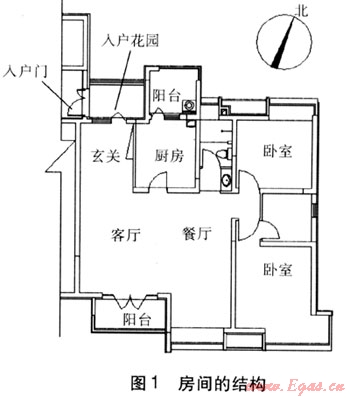本文以某居住建筑為實(shí)例進(jìn)行分析計(jì)算,該建筑各層層高為2.9m,共13層,房間的結(jié)構(gòu)(另一側(cè)為對稱結(jié)構(gòu))見圖1。該居住建筑按照2007版的建筑節(jié)能標(biāo)準(zhǔn)設(shè)計(jì),其設(shè)計(jì)節(jié)能率為65%,合理使用年限為50年。建筑面積為5083.2m2,建筑體積為14741.28m3,建筑表面積為4189.98m2,窗墻比分別為:南向0.45,東向0.11,西向0.11,北向0.24。