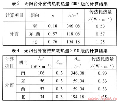 無陽臺外窗傳熱耗熱量,采用2007版的計(jì)算方法時(shí),由式(2)得到的計(jì)算結(jié)果見表3。采用2010版的計(jì)算方法時(shí),由式(5)、(6)得到的計(jì)算結(jié)果見表4。由表3、4可知,由2010版計(jì)算得到的計(jì)算結(jié)果大于2007版,說明2007版中無陽臺外窗傳熱耗熱量計(jì)算中采用一個(gè)綜合修正系數(shù)強(qiáng)化了太陽輻射得熱對外窗傳熱耗熱量的影響。