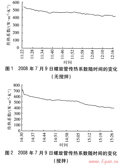 螺旋管傳熱系數(shù)隨時間的變化見圖1~2。