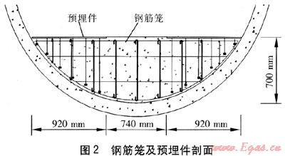 由隧道接收井處向始發(fā)井處進(jìn)行澆筑。當(dāng)混凝土運(yùn)輸車行駛到待澆筑位置時,啟動傳送帶上的電機(jī),打開料斗桶下方的活動擋板,混凝土依靠自重下落到傳送帶上,輸送至待澆筑位置?;炷翝仓r,為保證施工的順利進(jìn)行,需在待澆筑混凝土的正上方設(shè)置鋼支架跳板,跳板需距離混凝土成型面有一定的距離,以保證混凝土正常成型。隧道內(nèi)的混凝土運(yùn)輸時間較長,利用混凝土運(yùn)輸?shù)臅r間進(jìn)行軌道拆除。軌道每段長6m,將拆除的軌道吊掛在隧道壁上。在澆筑混凝土過程中,將預(yù)制好的鋼筋籠和預(yù)埋件安裝好,保證預(yù)埋件上表面水平,且和墊層處于同一水平面,澆筑時要嚴(yán)格按照施工規(guī)范進(jìn)行振搗?;炷翝仓瓿桑谑諠{后應(yīng)進(jìn)行養(yǎng)護(hù)。養(yǎng)護(hù)期間覆蓋保溫,并保持濕潤,覆蓋時注意不得損傷和污染混凝土表面。在混凝土上面漫鋪草袋,進(jìn)行灑水養(yǎng)護(hù)[2]。鋼筋籠及預(yù)埋件剖面見圖2。