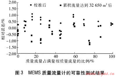 用于城市天然氣計量的質(zhì)量流量計,其可靠性十分重要,可靠性故障會給燃?xì)夤芾韼砝щy,甚至引起貿(mào)易糾紛。在MEMS質(zhì)量流量計的可靠性測試中,采用了加速實驗的方法。一臺管徑為32mm,最大標(biāo)稱流量為16m3/h的MEMS質(zhì)量流量計在校準(zhǔn)后和累積流量達(dá)到32650m3后的質(zhì)量流量相對誤差見圖3,同一工況、同一質(zhì)量流量下的3個相對誤差值代表3次重復(fù)性測量的結(jié)果(圖3中有些點重合)。該MEMS質(zhì)量流量計適用于小型餐飲用戶等的天然氣計量,這類用戶平均每天用氣約6h,平均小時流量約為8m3/h,因此32650m3的天然氣約需要使用2年。由圖3可知,累積使用2年后,MEMS質(zhì)量流量計的測量精度仍能滿足要求。