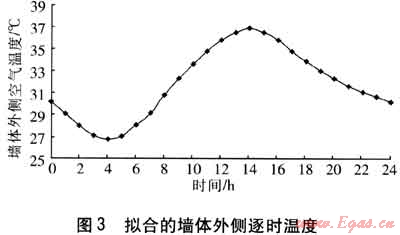 b. 墻體外側(cè)空氣溫度呈簡(jiǎn)諧波規(guī)律變化,本文選取武漢作為夏熱冬冷地區(qū)的典型城市進(jìn)行分析,利用武漢夏季某典型日的室外空氣溫度[15]。進(jìn)行計(jì)算,擬合的墻體外側(cè)逐時(shí)溫度見圖3。
