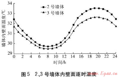 對(duì)比采用不同絕熱材料和絕熱形式的墻體。2號(hào)墻體采用30mm厚EPS板的外保溫形式,3號(hào)墻體采用190mm厚混凝土空心砌塊(內(nèi)填膨脹珍珠巖)的自保溫形式。2、3號(hào)墻體的衰減度分別為35.68、64.73。在同一溫度波的連續(xù)作用下,2、3號(hào)墻體內(nèi)壁面逐時(shí)溫度見圖5。由圖5可知,3號(hào)墻體的內(nèi)壁面溫度低于2號(hào)墻體,因此衰減度大的墻體,內(nèi)壁面溫度較低。對(duì)于外保溫和自保溫墻體,宜考慮采用衰減度大的自保溫墻體。但既有建筑進(jìn)行自保溫改造困難較大,因此自保溫更適用于新建建筑。