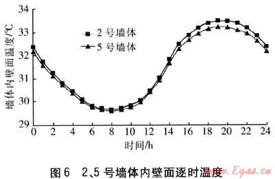 對(duì)比不同厚度絕熱材料的外保溫墻體。2號(hào)墻體采用30mm厚EPS板作為絕熱材料,5號(hào)墻體采用50mm厚EPS板作為絕熱材料。2、5號(hào)墻體的衰減度分別為35.68、47.26。在同一溫度波的連續(xù)作用下,2、5號(hào)墻體內(nèi)壁面逐時(shí)溫度見圖6。由圖6可知,5號(hào)墻體的內(nèi)壁面溫度波動(dòng)范圍小于2號(hào)墻體,且前者內(nèi)壁面溫度低于后者。因此衰減度大的墻體內(nèi)壁面溫度更低,熱穩(wěn)定性更好。但2號(hào)與5號(hào)墻體內(nèi)壁面溫度差別不大,因此隨著絕熱材料厚度的增加,絕熱效果改善不明顯。