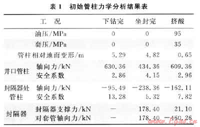 首先對初始測試管柱進行力學分析(表1),座封下放管柱懸重20t,座封時油管內(nèi)外流體密度1.98g/cm3,加砂壓裂時油管內(nèi)外流體密度1.02g/cm3。