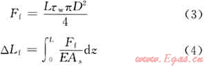 對于帶封隔器井下管柱,隨著井筒壓力、溫度等參數(shù)變化而產(chǎn)生溫度效應(yīng)、活塞效應(yīng)、鼓脹效應(yīng)、螺旋彎曲效應(yīng)。對這4個基本效應(yīng)產(chǎn)生的管柱變形及其變形力,國內(nèi)外學者已經(jīng)做了大量研究,此不贅述。對于深層氣井,高速擠酸過程中,流體粘滯摩阻效應(yīng)是引起管柱變形的重要因素,也是造成管柱、封隔器失效的主要原因。因此,在分析管柱變形時除了要考慮上述4種基本效應(yīng)外,還必須考慮流體粘滯摩阻效應(yīng),粘滯摩阻力(Ff)和摩阻效應(yīng)變形(△Lf)分別由下式表示[7~8]: