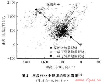 為了增加裂縫和氣層的接觸面積以提高氣井的初始產(chǎn)氣量和采收率,目前一般采用10~20級的壓裂以增加裂縫的連通。通過井場實(shí)時微地震來進(jìn)行監(jiān)控(圖2),可以確定井眼東西和南北方向的裂縫頂端的方位,并且隨著壓裂作業(yè)的進(jìn)行而跟蹤裂縫的形成過程。裂縫垂向的延伸具有特別重要的作用,作業(yè)者需要特別關(guān)注確保裂縫沒有延伸到頁巖層之外或者鄰近的水層中去,不然會使頁巖氣井的經(jīng)濟(jì)效益減少。