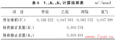 根據(jù)LNG液相平均溫度與混合物分子量(M),可以在表3~5中利用線性插值法求得相應(yīng)溫度下各組分的摩爾體積(Vi)與體積修正系數(shù)(K1、K2)值,結(jié)果見表6。