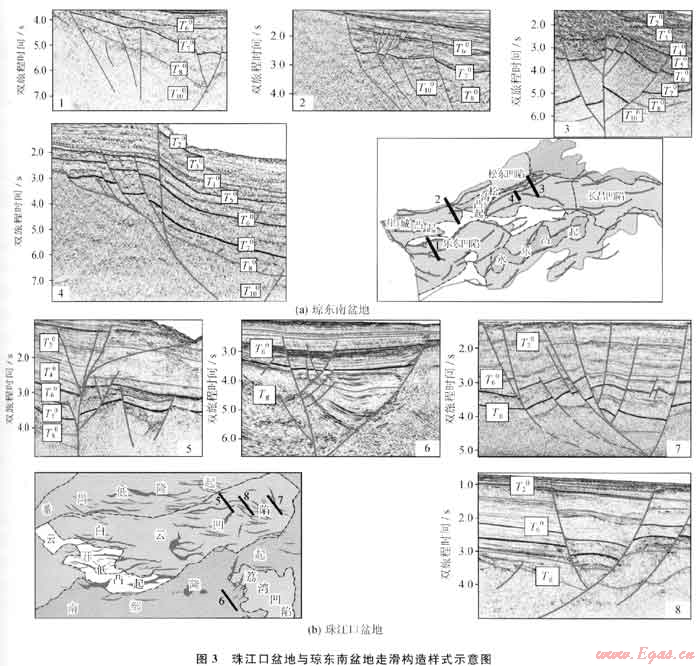 瓊東南盆地、珠江口盆地古近系內分布著廣泛的伸展構造,瓊東南盆地內的崖北凹陷、崖南凹陷、松東凹陷、松西凹陷及北礁凹陷,珠江口盆地內的開平順德凹陷均為半地塹凹陷,在邊界斷層控制下盆地發(fā)生翹傾減薄,在地震剖面上可見明顯的削蝕界面。而瓊東南盆地的中央坳陷帶內的樂東-陵水凹陷及寶島長昌凹陷則表現(xiàn)為明顯的地塹結構,盆地內表現(xiàn)為地壘-地塹式及復式地塹構造樣式。白云-荔灣凹陷內部伸展構造樣式主要表現(xiàn)為由一系列斷層控制的鏟式及坡坪式的復式半地塹,局部發(fā)育“X”型構造樣式。