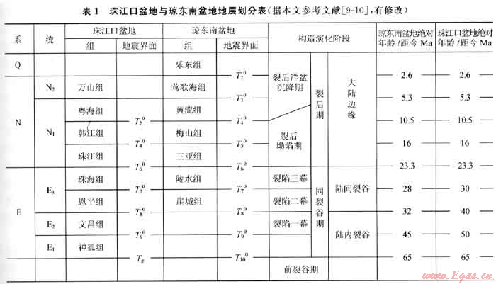 據鉆井及地震資料揭示,南海北部陸緣盆地新生代沉積地層自下而上可劃分為:前古近系基底,古近系古新統(tǒng)、始新統(tǒng)及漸新統(tǒng),新近系中新統(tǒng)、上新統(tǒng),第四系。盆地構造演化階段經歷了古近紀裂陷階段(具體可劃分為3個裂陷幕),新近紀-早、中中新世裂陷后坳陷階段及晚中新世第四紀裂陷后洋盆沉降期3個階段(表1)。