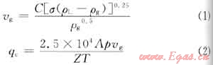 式中vg為氣體帶水最小卸載流速,m/s;C為Turner系數(shù),C=2.04;σ為液滴表面張力,N/m;ρL為液體的密度,kg/m3;ρg為氣體的密度,kg/m3;qc為最低攜液產(chǎn)氣量,104m3/d;A為油管橫截面積,m2;p為壓力,MPa;Z為天然氣壓縮因子;T為井底溫度,K。