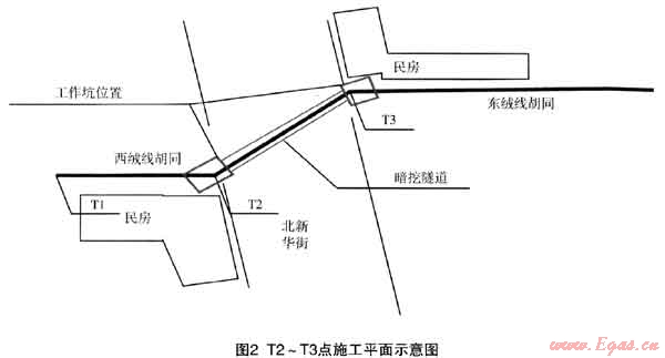 由于2008年為奧運(yùn)年,北新華街及西絨線(xiàn)胡同剛剛重新修整完畢,根據(jù)市交管局要求不得破路施工。因此,整體工程T1~T3點(diǎn)采用非開(kāi)挖施工,T3~T4點(diǎn)采用明開(kāi)挖施工。