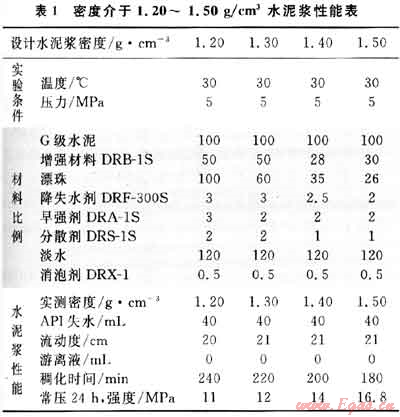 2) 1.30g/cm3:水泥100+DRB-1S 50+漂珠60+降失水劑DRF-300S 3+早強劑DRA-1S 2+分散劑DRS-1S 2+消泡劑DRX-1 0.5+水120。