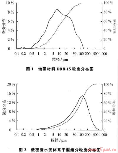 選定漂珠為減輕劑后,由于水泥的粒徑主要集中在20~30μm,漂珠粒徑集中于80~100μm,據(jù)固體懸浮模型,相鄰充填細微膠凝材料的尺寸dm50應(yīng)在被充填材料顆粒尺寸dm50的1/2.5~1/10范圍內(nèi)(dm50為顆粒累計體積分數(shù)為50%處的顆粒直徑)。以固體懸浮模型為指導(dǎo),開發(fā)了增強材料DRB-1S。DRB-1S由具有火山灰性質(zhì)的多種礦物微粉復(fù)配組成,在水泥漿中起到填充作用、級配調(diào)節(jié)作用和晶核作用[8~10]。