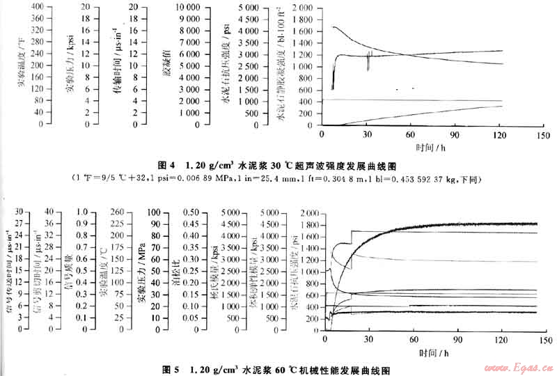 用5265型靜膠凝強度測試儀和6265型機械性能測試儀進行了水泥漿強度發(fā)展和機械性能測試;圖4與圖5分別是1.20g/cm3密度水泥漿在30℃下的強度發(fā)展曲線和60℃下的機械性能發(fā)展曲線。