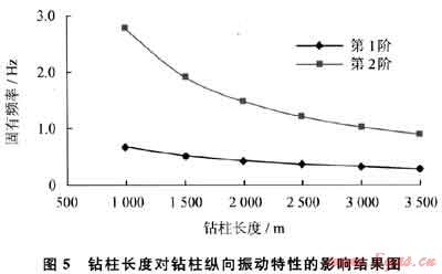 計算結(jié)果如圖5所示。從圖5可以看出,鉆柱長度的變化對鉆柱縱向振動的影響變化較大。根據(jù)數(shù)據(jù),鉆柱長度由2000m增加至3500m時,第2階固有頻率由1.4Hz變化至0.9Hz,轉(zhuǎn)換成轉(zhuǎn)盤轉(zhuǎn)速為84~54r/min,空氣鉆井常用轉(zhuǎn)盤轉(zhuǎn)速在60~70r/min,正好位于54~84r/min的轉(zhuǎn)速范圍之內(nèi),鉆柱產(chǎn)生縱向共振的概率非常高。