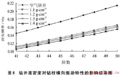 由于鉆井液的存在,鉆柱在進(jìn)行軸向運動的時候,受到鉆井液的黏滯作用。根據(jù)鉆井液的流變特性,其密度越高,黏度越大,對鉆柱軸向運動的阻礙作用越明顯??梢姡@井液會對鉆柱縱向振動的固有頻率產(chǎn)生很大影響,改變縱向振動的臨界轉(zhuǎn)速,這種影響必須引起足夠的重視。