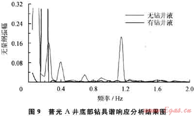 從圖9可以看出,普光A井底部鉆具組合在0.2Hz和1.1Hz的頻率下,產(chǎn)生了很大的位移響應(yīng),即在轉(zhuǎn)速為12r/min和66r/min時,鉆柱很容易產(chǎn)生較大的橫向共振,使鉆柱內(nèi)部產(chǎn)生很大的交變應(yīng)力。而使用鉆井液時鉆柱只在頻率為0.14Hz時產(chǎn)生很大位移響應(yīng),對應(yīng)的轉(zhuǎn)速為8.4r/min,遠(yuǎn)遠(yuǎn)小于常用轉(zhuǎn)速,不會對鉆柱產(chǎn)生實質(zhì)性危害。普光A井在空氣鉆井時采用了65r/min的轉(zhuǎn)速,外部激勵頻率與使鉆柱產(chǎn)生最大位移響應(yīng)的固有頻率非常接近,極易發(fā)生鉆柱的橫向共振,在鉆進(jìn)過程中,出現(xiàn)了3次鉆柱斷裂事故,理論計算與現(xiàn)場結(jié)果吻合。