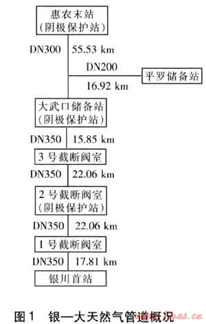 石嘴山市天然氣工程管道(簡稱銀-大天然氣管道)起點為銀川的銀川首站,在大武口區(qū)和平羅縣分別設分輸站,末站設在惠農(nóng)區(qū)的煤氣廠。該管道全長150.23km,管道規(guī)格分別為DN 350、300、200mm,設計年輸氣能力為6×108m3/a。該管道距離較長,采用強制電流陰極保護。銀-大天然氣工程管道概況見圖1。