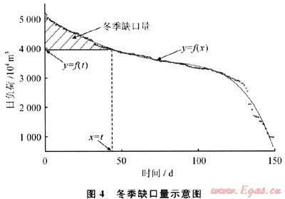 式中Qt為冬季缺口氣量,104m3;f(t)=qmax為上游供氣管網(wǎng)的最大日負(fù)荷,104m3,也就是直線x=t和曲線y=f(x)交點的縱坐標(biāo)值。