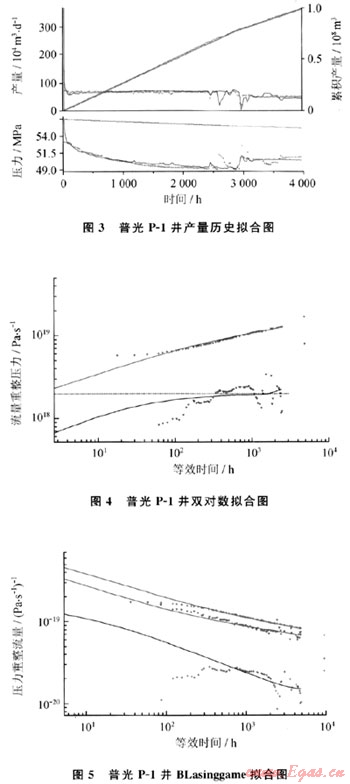 收集了普光P-1井投產(chǎn)后的測(cè)試數(shù)據(jù),其中井口數(shù)據(jù)包括井口油壓、產(chǎn)量、溫度以及實(shí)際日產(chǎn)水量,井下測(cè)試數(shù)據(jù)包括井底流壓、井底溫度,累計(jì)224d的數(shù)據(jù)。并采用試井分析軟件對(duì)數(shù)據(jù)進(jìn)行資料解釋研究[4~6],從雙對(duì)數(shù)擬合圖上看,曲線沿1/4攀升,具有裂縫特征。因此數(shù)據(jù)分析解釋模型采用:有限導(dǎo)流+均質(zhì)氣藏+圓形邊界。曲線擬合較好,解釋結(jié)果為:初始?jí)毫?6.6MPa,平均有效滲透率0.197mD,地層系數(shù)62.36mD·m,裂縫半長(zhǎng)62.2m,探測(cè)半徑797.7m(圖3~5)。