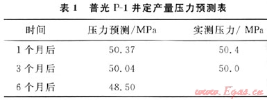 同時(shí)在資料解釋后按定產(chǎn)量的方式進(jìn)行預(yù)測(cè)。保持產(chǎn)量在47.9×104m3/d不變的情況下,生產(chǎn)1個(gè)月、3個(gè)月、6個(gè)月后進(jìn)行壓力預(yù)測(cè),井底壓力分別下降至50.37MPa、50.04MPa、48.50MPa,與生產(chǎn)后實(shí)測(cè)壓力基本吻合,其預(yù)測(cè)結(jié)果見表1。