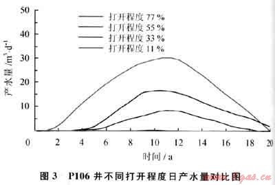 數(shù)值模擬研究結(jié)果表明:當(dāng)打開11%時(shí),由于氣層上部位置主要為Ⅲ類儲(chǔ)層,物性差,氣井生產(chǎn)基本不見水,但穩(wěn)產(chǎn)期不足3a。當(dāng)打開33%、55%、77%時(shí),見水時(shí)間分別為5.2a、3.5a、1.4a,無(wú)水期采出程度分別為15.1%、8.8%、6.2%;當(dāng)打開程度大于77%時(shí),由于氣層中、下部位置多為Ⅱ類儲(chǔ)層,且局部發(fā)育裂縫,儲(chǔ)層物性較好,開發(fā)過(guò)程中邊水將快速推進(jìn)??梢?,隨著P106井氣層打開程度的不斷增加,無(wú)水采氣期將逐漸縮短,相應(yīng)的無(wú)水期采出程度將逐步降低,而穩(wěn)產(chǎn)期因多因素影響將發(fā)生由低到高然后降低的變化。由此認(rèn)為,P106井氣層自上而下打開程度控制在55%左右為最優(yōu)[6](圖3)。