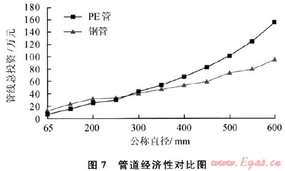通過管徑與管線總投資關(guān)系的研究,當采氣、集氣管道的公稱直徑小于等于200mm時,采用PE管道,投資低;當采氣、集氣管道的公稱直徑大于200mm時,采用鋼制管道,投資低(圖7)。本示范工程中公稱直徑在200mm以下管線均采用PE100聚乙烯管線。