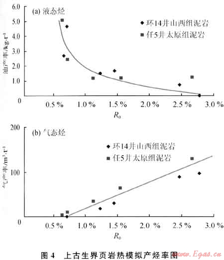 鄂爾多斯盆地環(huán)14井山西組頁巖和任5井太原組頁巖的熱模擬實驗結果表明(圖4):Ro<0.7%時,幾乎沒有氣態(tài)烴產出;Ro介于0.7%~1.1%時,液態(tài)烴產率隨Ro增大迅速下降,而氣態(tài)烴產率則迅速增大,但產率數值還很??;Ro>1.1%時,液態(tài)烴產率隨Ro增大緩慢下降,而氣態(tài)烴產率隨R,增大迅速增大;Ro為2.5%時的氣態(tài)烴產率達到110m3/t(有機碳)。從該區(qū)上古生界頁巖的Ro大都超過1.1%可見,上古生界頁巖以生成氣態(tài)烴為主,僅有少量液態(tài)烴。