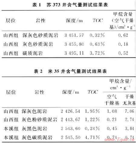 含氣量是評價頁巖含氣性的最重要指標。由于頁巖氣勘探在鄂爾多斯盆地尚處于探索階段,在石炭-二疊系泥頁巖段很難設計取心,因此2010年筆者在蘇373和米35井砂巖段的取心過程中,挑選了其中夾持的泥頁巖段進行含氣量分析,雖然不能完全代表石炭-二疊系泥頁巖段的真實含氣量,但也具有一定的參考價值。