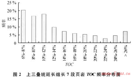 長7段頁巖TOC很高(圖2),主要分布于6.O0%~14.00%之間,最高可超過26.O0%。殘留氯仿瀝青 “A”含量大都介于0.70%~1.00%。熱解生烴潛量主要介于10~60mg/g,最高逾100mg/g。