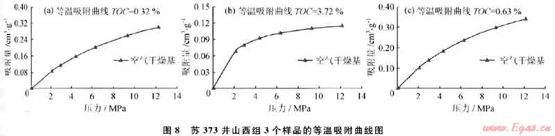 分析蘇373井3個樣品的等溫吸附曲線(圖8)可知:砂質泥巖比碳質泥巖的甲烷吸附能力強,而同種巖性,TOC與甲烷吸附能力成正比,如T0C為0.6 3%的樣品在壓力為6MPa時,甲烷吸附能力為0.23g/cm3,壓力增加到12MPa時,甲烷吸附能力增至0.34g/cm3。