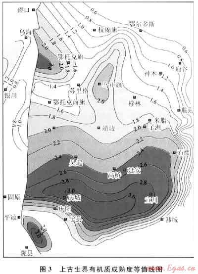 鄂爾多斯盆地上古生界地層的Ro集中在1.1%~2.5%,大部分處于高成熟階段,其Ro等值線圖顯示出(圖3),慶城-宜川一帶熱演化程度最高,Ro達到3.0%;烏審旗一帶Ro約為2.0%,鄂托克旗地區(qū)局部Ro最高達3.0%。除東北部杭錦旗 鄂爾多斯-府谷一線以外、東南部大荔向外、西南部固原以西等盆地邊緣地區(qū),上古生界地層絕大部分地區(qū)Ro均超過1.1%,達到了形成頁巖氣藏的成熟度標準。其中榆林地區(qū)Ro介于1.1%~2.5%,處于有利于生成頁巖氣的成熟度范圍內。