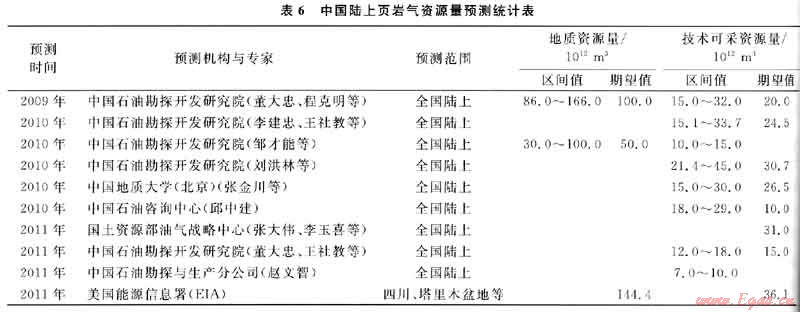 據(jù)不同學(xué)者或機(jī)構(gòu)對(duì)頁(yè)巖氣資源的預(yù)測(cè)(表6),中國(guó)頁(yè)巖氣地質(zhì)資源量介于30×1012~166×1012m3,技術(shù)可采資源量介于7×1012~45×1012m3。據(jù)此,有專家預(yù)測(cè)中國(guó)頁(yè)巖氣年產(chǎn)量近10年內(nèi)有望達(dá)到100×108m3左右,主要取決于理論突破、技術(shù)進(jìn)步、成本降低和政策扶持??偟恼J(rèn)為,中國(guó)頁(yè)巖氣具有較好的發(fā)展前景。