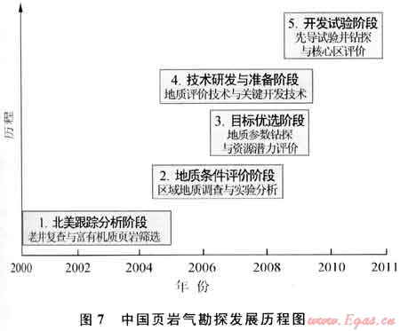 與北美相比,中國(guó)頁(yè)巖氣勘探起步較晚,而與全球其他地區(qū)相比,中國(guó)頁(yè)巖氣勘探處于領(lǐng)先地位,為北美以外地區(qū)率先實(shí)現(xiàn)頁(yè)巖氣突破和工業(yè)化先導(dǎo)試驗(yàn)的國(guó)家。實(shí)際上,中國(guó)油氣勘探界對(duì)于頁(yè)巖氣并不陌生。1994—1998年間中國(guó)針對(duì)頁(yè)巖裂縫油氣藏做過(guò)大量工作,此后一些學(xué)者在個(gè)別地區(qū)涉及過(guò)頁(yè)巖氣的研究。迄今,中國(guó)頁(yè)巖氣勘探經(jīng)歷了頁(yè)巖裂縫性油氣藏勘探、基礎(chǔ)地質(zhì)條件研究與技術(shù)儲(chǔ)備、工業(yè)性突破等3個(gè)階段(圖7),邁入工業(yè)化生產(chǎn)先導(dǎo)試驗(yàn)階段。